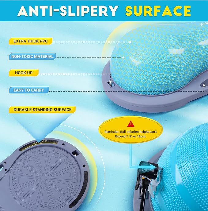 - SAFE & ANTI-SLIP DESIGN: Our balance ball is made with slip resistant material that allows you to safely exercise with the ball worry-free. You can safely stand, jump, or kneel on the ball to practice your balance. The upgraded textured surface allows for a stronger grip, so you can avoid injuries and accidents while trying to improve your coordination and agility.