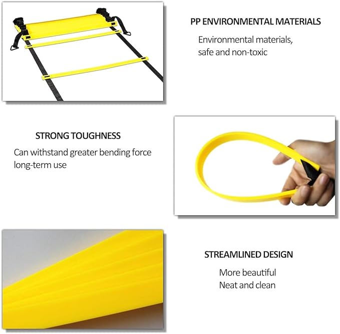 - 【AGILITY LADDER WITH FLEXIBLE DESIGN】This speed ladder crafted with high-quality PP material designed to last for years of use and training. It is flexible and adjustable, the space between rungs is adjustable up to 15" inch. You can simple adjust it in the nylon straps and secure it in place with rust-resistant metal pegs so as to meet your workout demands