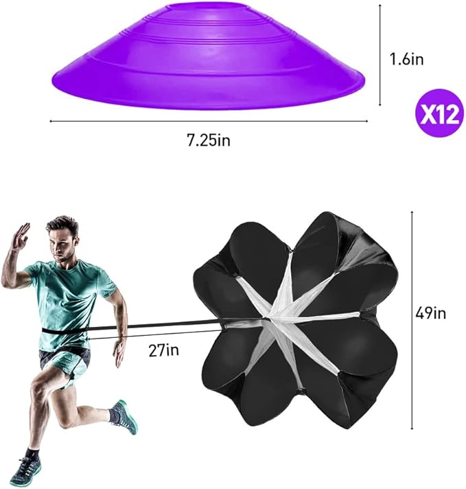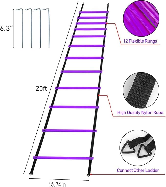 - 【SPORTS TRAINING SET】: This sports training set includes an 12 Rung 20ft Agility Ladder, 12 Purple Disc Cones, 1 Resistance Parachute, 4 Steel Stakes and a Drawstring Bag. Everything needed is ready for Improve fitness, agility, speed, vertical jump, and explosiveness.
