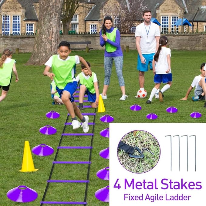 - 【SPORTS TRAINING SET】: This sports training set includes an 12 Rung 20ft Agility Ladder, 12 Purple Disc Cones, 1 Resistance Parachute, 4 Steel Stakes and a Drawstring Bag. Everything needed is ready for Improve fitness, agility, speed, vertical jump, and explosiveness.