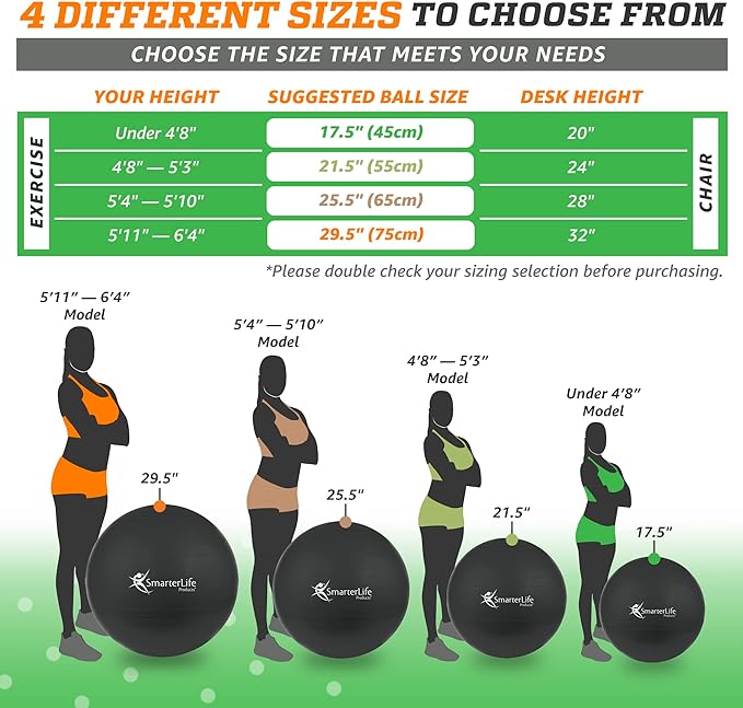 • THE RIGHT SIZE FOR YOU: We offer a choice of 45 cm, 55 cm, 65 cm, and 75 cm sizes to suit your height so that you can easily and conveniently find the correctly sized work out ball to sit on or exercise with. Our sizing chart uses the user’s height to help you select the correct size for workouts and uses desk height to help you select for use as a chair.