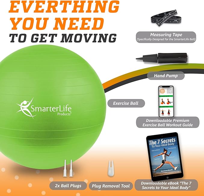 • WHAT'S INCLUDED: We include the exercise sitting ball, an exercise ball pump, inflation measuring tape, two (2) ball plugs with a removal tool, an exclusive downloadable complete body workout guide, and a downloadable eBook called "The 7 Secrets to Your Ideal Body." Also downloadable is our “Premium Exercise Ball Workout Guide” which picks up where the included-in-the-box “QuickStart Exercise Guide” leaves off. The download instructions are included in a sheet in the box.