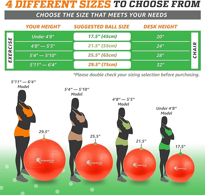 - THE RIGHT SIZE FOR YOU: We offer a choice of 45 cm, 55 cm, 65 cm, and 75 cm sizes to suit your height so that you can easily and conveniently find the correctly sized work out ball to sit on or exercise with. Our sizing chart uses the user’s height to help you select the correct size for workouts and uses desk height to help you select for use as a chair.