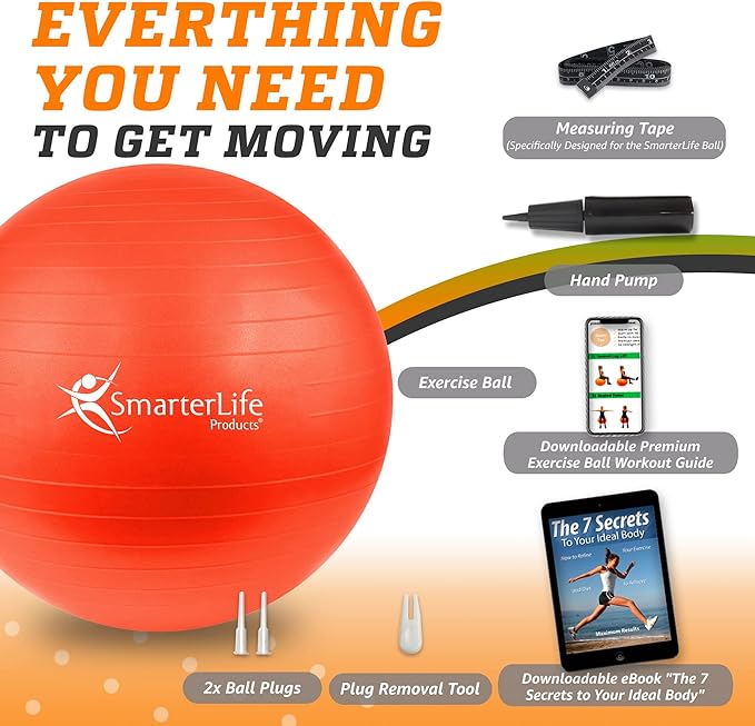 • WHAT'S INCLUDED: We include the exercise sitting ball, an exercise ball pump, inflation measuring tape, two (2) ball plugs with a removal tool, an exclusive downloadable complete body workout guide, and a downloadable eBook called "The 7 Secrets to Your Ideal Body." Also downloadable is our “Premium Exercise Ball Workout Guide” which picks up where the included-in-the-box “QuickStart Exercise Guide” leaves off. The download instructions are included in a sheet in the box.