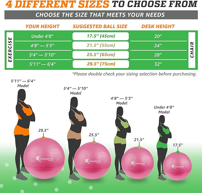 - THE RIGHT SIZE FOR YOU: We offer a choice of 45 cm, 55 cm, 65 cm, and 75 cm sizes to suit your height so that you can easily and conveniently find the correctly sized work out ball to sit on or exercise with. Our sizing chart uses the user’s height to help you select the correct size for workouts and uses desk height to help you select for use as a chair.