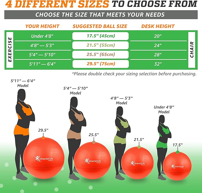 • THE RIGHT SIZE FOR YOU: We offer a choice of 45 cm, 55 cm, 65 cm, and 75 cm sizes to suit your height so that you can easily and conveniently find the correctly sized work out ball to sit on or exercise with. Our sizing chart uses the user’s height to help you select the correct size for workouts and uses desk height to help you select for use as a chair.
