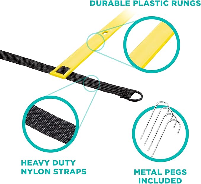 - [HIGH QUALITY MATERIALS AND DESIGN] - Our Agility Ladder is made of high-quality resilient materials that will last for years. It has durable tangle-free nylon straps. The rungs are made of sturdy plastic that will not degrade in the outdoor weather. The pegs are rust-resistant metal. Snaps at the end can be attached to other ladders if required.