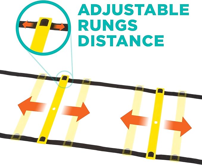 - [MULTIFUNCTIONAL & EASY TO USE] – The ladder is easy to set up and use. Simply place on the ground and stretch out the nylon straps. Slide the rungs out and extend to the distances you want. The rungs can be placed close together or further apart to provide different training challenges. When you are done, slide the rungs back, pick up and store in the carry bag. The ladder is lightweight and easy to transport.