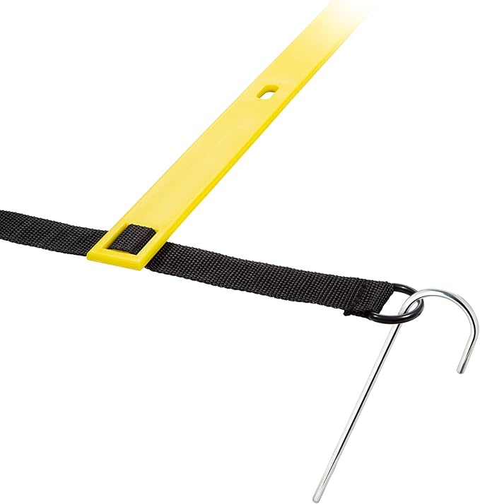 - [HIGH QUALITY MATERIALS AND DESIGN] - Our Agility Ladder is made of high-quality resilient materials that will last for years. It has durable tangle-free nylon straps. The rungs are made of sturdy plastic that will not degrade in the outdoor weather. The pegs are rust-resistant metal. Snaps at the end can be attached to other ladders if required.