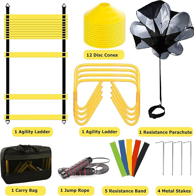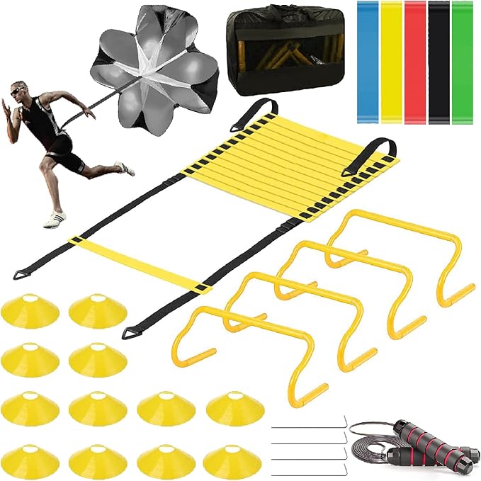 - 【AGILITY TRAINING EQUIPMENT】OFYDNR Agility Sports Training set includes 20ft PP Agility Ladder, 4 Agility Hurdles, 1 Resistance Parachute,12 Disc Cones, 4 Steel Steaks, 1 Jump Rope, 5 Loop Resistance Bands and 1 Zipper Handbag. Everything needed is ready for train body agility, improve speed, and explosive force.