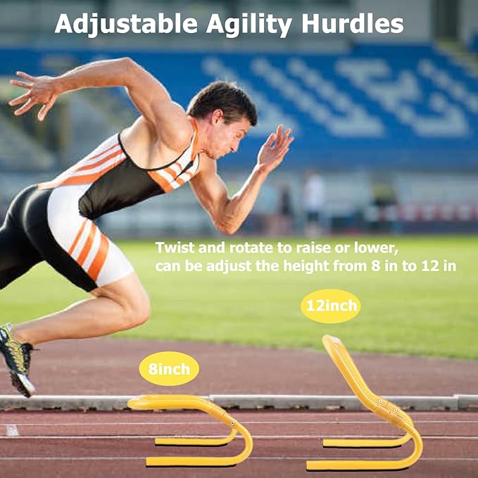 - 【ADJUSTABLE HURDLES】The adjustable hurdles are easy to adjust to meet your different exercise needs, you can choose a height of 8.3 inches or 11.6 inches by rotating the hurdle leg.