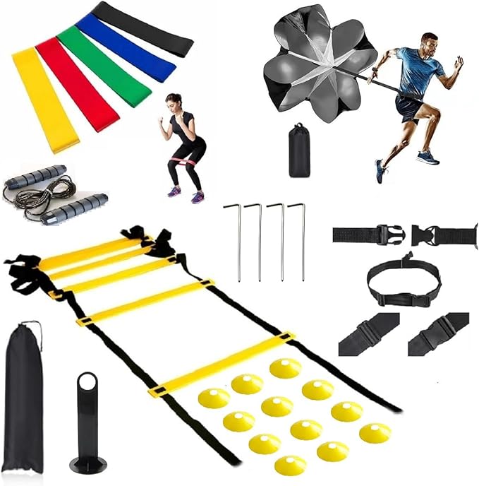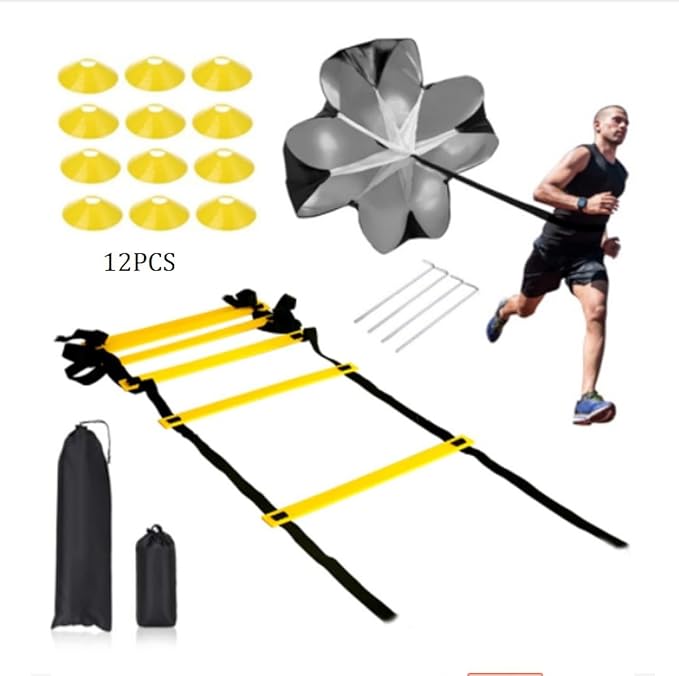 - 【Agility Ladder Training Kit】It includes a 12 rungs 20Ft agility ladder, 1 resistance running parachute, 12 yellow disc cones, 4 steel stakes, 5Pcs resistance bands, 1 Skipping Rope, and 1 storage bag.