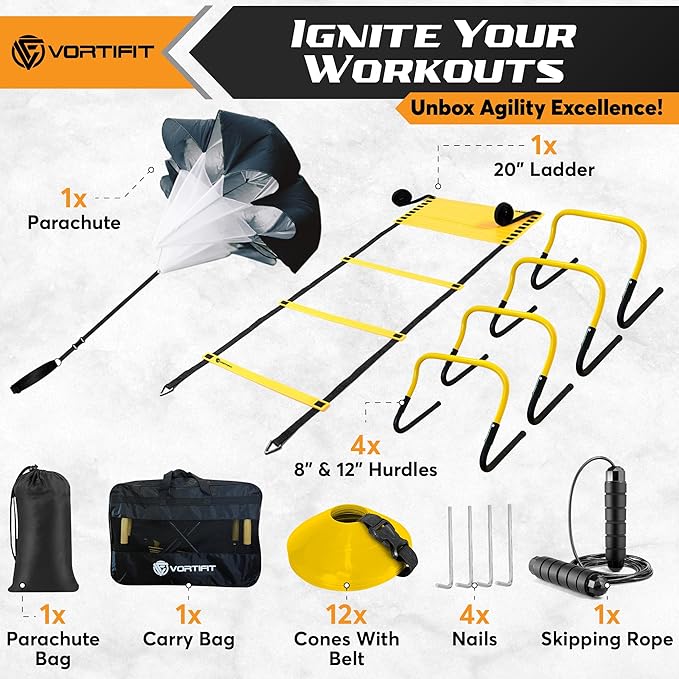 - Agility training equipment set - Features a 20-foot ladder, 4 Two-Height Hurdles, 12 cones with Carry Belt, and a Running Parachute with Bag. Ideal for all—beginners to experts—for comprehensive agility training.