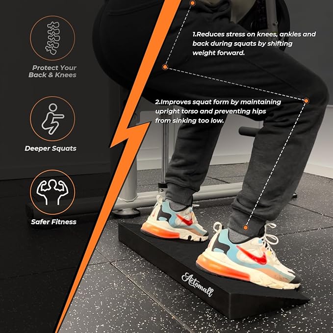 - 【One-piece Design for Greater Stability and Balance】Unlike traditional two-piece squat wedges,Our 1-piece squat wedge offers greater stability and balance during intense workouts, distributing weight more evenly to lower stress on your lumbar spine and knees. Achieve deeper squats safely.