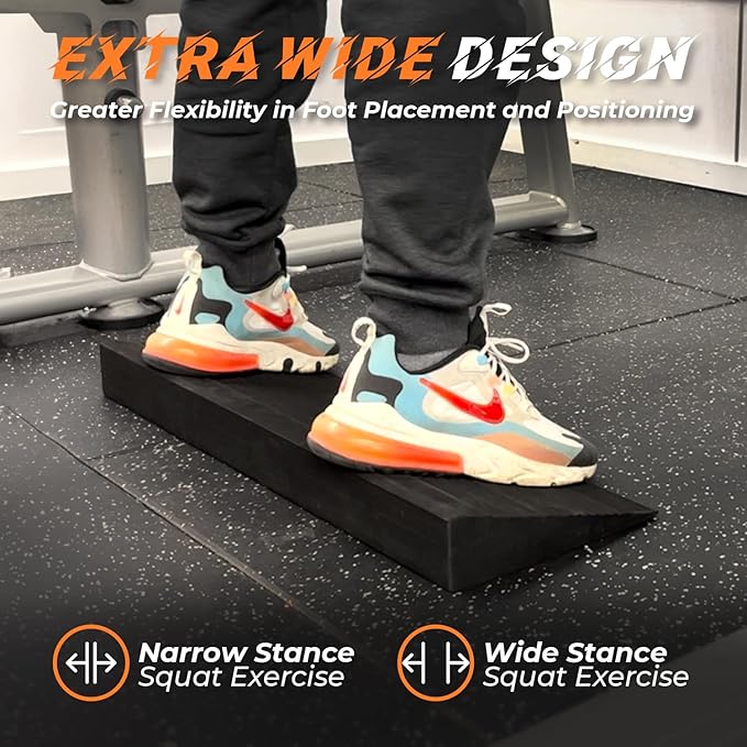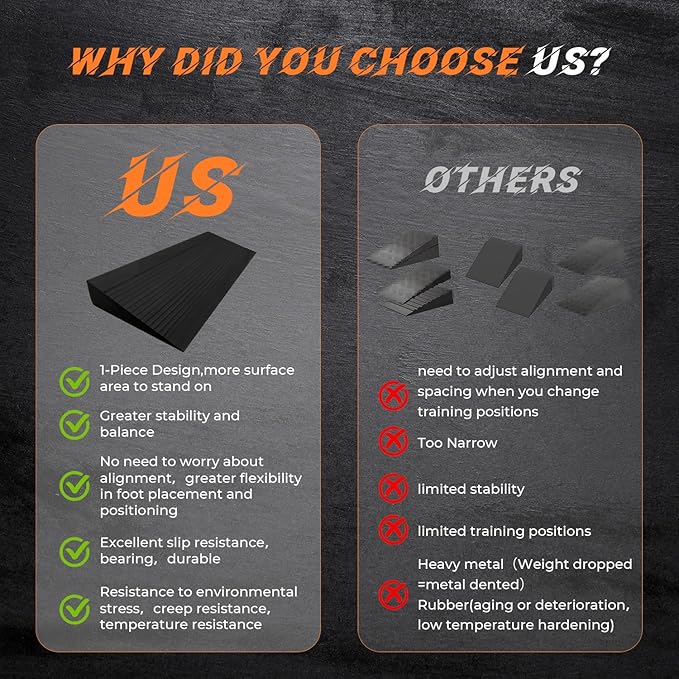 - 【Easy to Use, Flexible, and Adaptable】Throw it down and go! 27 " long and 10 " wide, gives you more surface area to stand on, and offers greater versatility for a variety of exercises, including heavy duty squats, weighted squats, lunges, and calf raises. Greater flexibility in foot placement and positioning, never worry about two-piece alignment and frequent adjustments to the spacing between the two wedges, never tipping over!