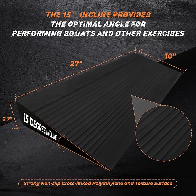- 【Ultimate Incline】 At an optimal 15-degree incline, the one-piece squat wedge hits the perfect sweet spot for various exercises like toes elevated splits squats and calf stretches, weightlifting, recovery training, and much more. This incline angle also allows you to safely and flexibly experiment with different workout styles and achieve even more intense workouts.