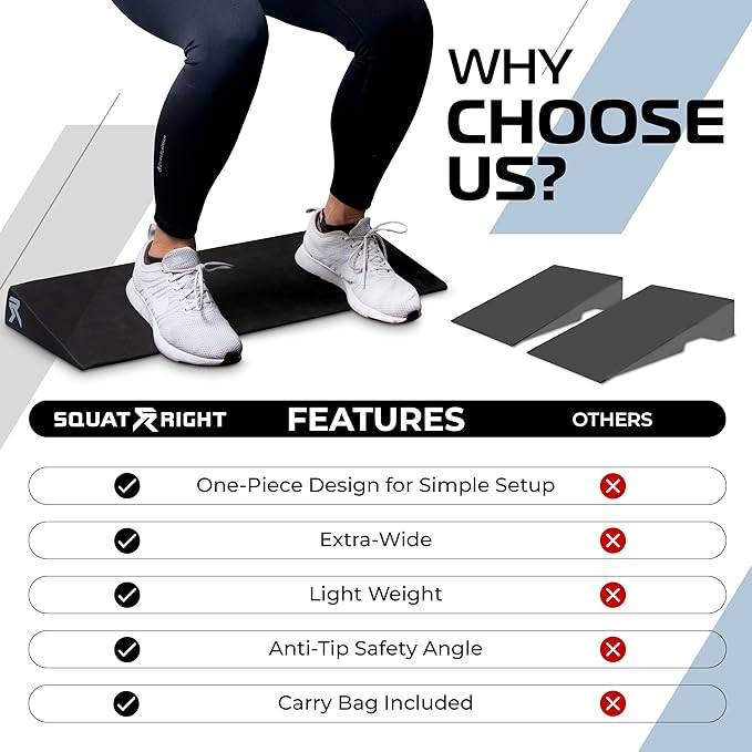 - SAFETY ANGLE ➔ Squat Right heel wedge for squats boasts an improved anti-tip angle for added security during specific exercises. Stay balanced and confident throughout your training, knowing that your safety is our top priority.