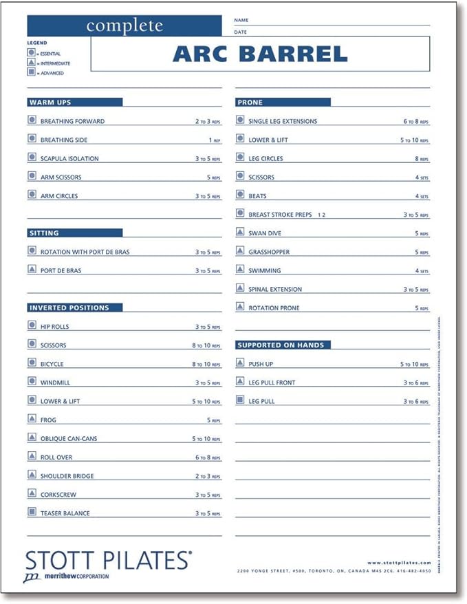 STOTT PILATES Client Workout Sheets - Complete Arc Barrel