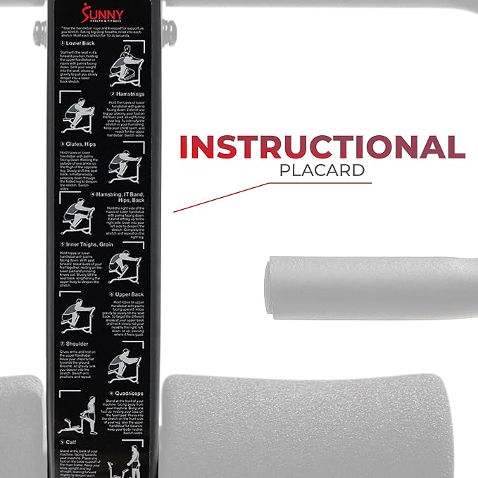 - INSTRUCTIONAL PLACARD: Detailed instructions for 9 different stretches help you get started on your stretching regimen.