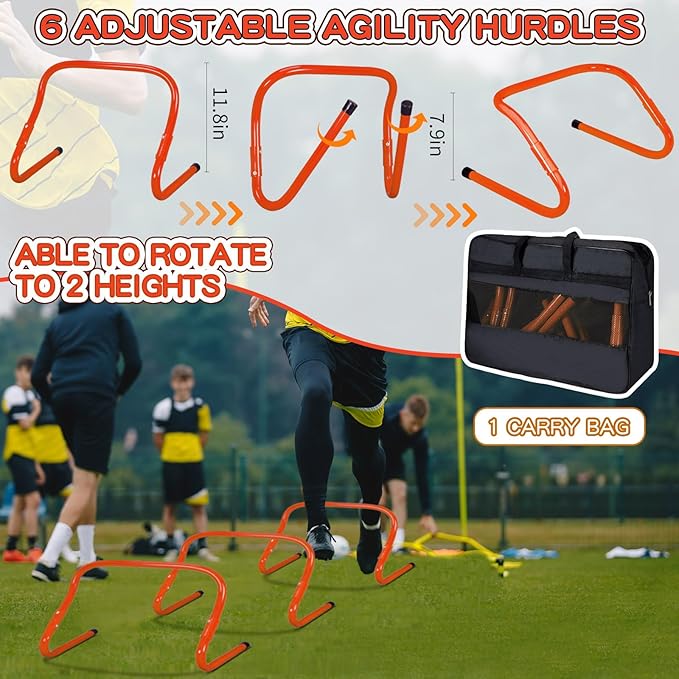 • Agility Training Equipment Set: the set of soccer agility training equipment includes 1 agility ladder for kids with 4 stakes, 6 adjustable hurdles, 16 soccer cones for training with a storage pole, 2 resistance bands with ankle strap, 1 parachute with storage bag, 5 exercise bands, 1 jump rope and 3 carries bags