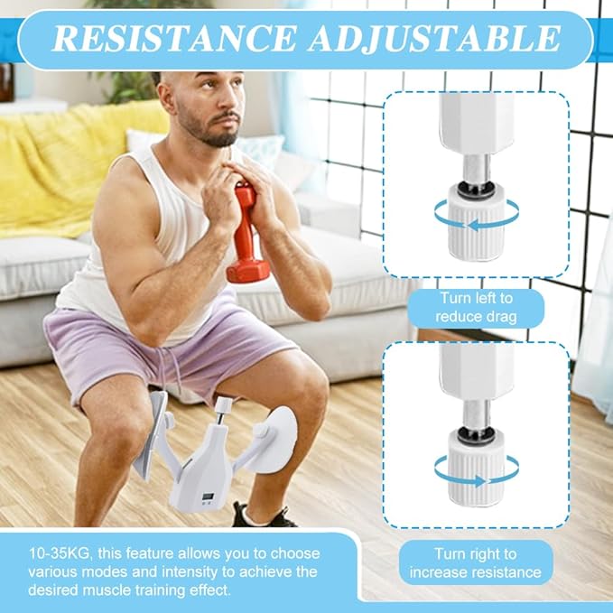 - 【RESISTANCE ADJUSTABLE】The central knob on the thigh trainer is adjustable, allowing you to choose the resistance, 10-35KG, this feature allows you to choose various modes and intensity to achieve the desired muscle training effect.
