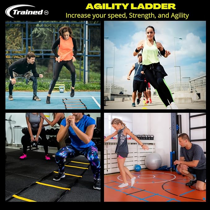 - ⚾ IMPROVE YOUR SPEED, FOOTWORK, SKILL & EXPLOSIVENESS FOR ALL SPORTS: Our speed Ladder kit is a leading tool to workout for adults and kids who want to get in shape or dominate in competitive sports such as soccer, basketball, baseball, football, track and field, tennis, rugby or any sport demanding quickness, acceleration and alertness. The perfect fitness ladder!