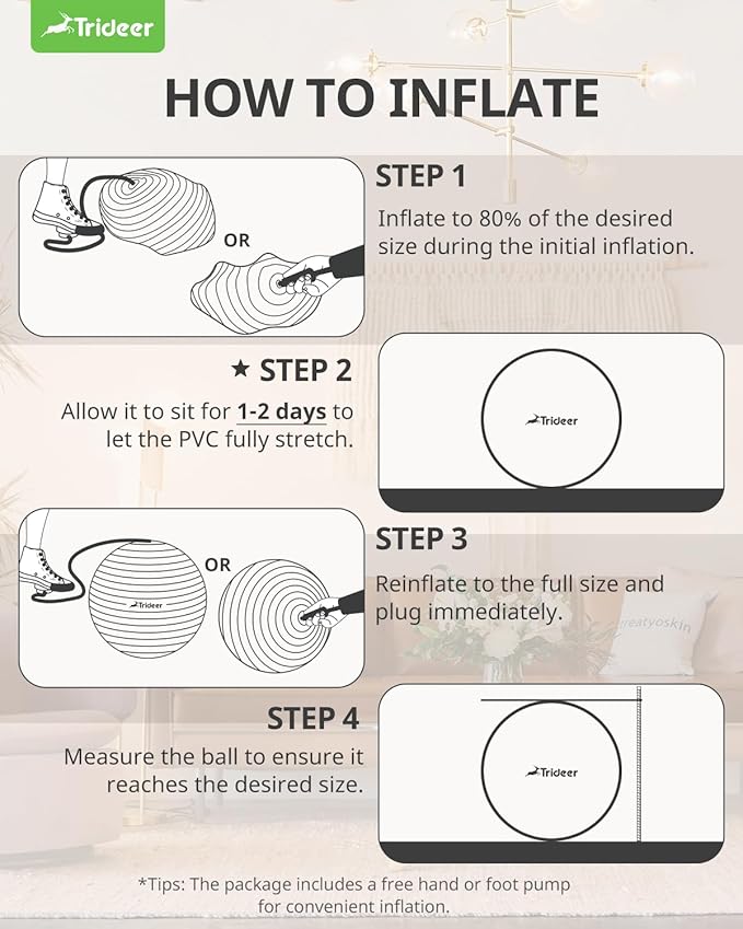 - Inflation Instructions: Let the ball sit for 2-3 days after the initial inflation, then inflate it again to allow it to be stretched to the desired size.