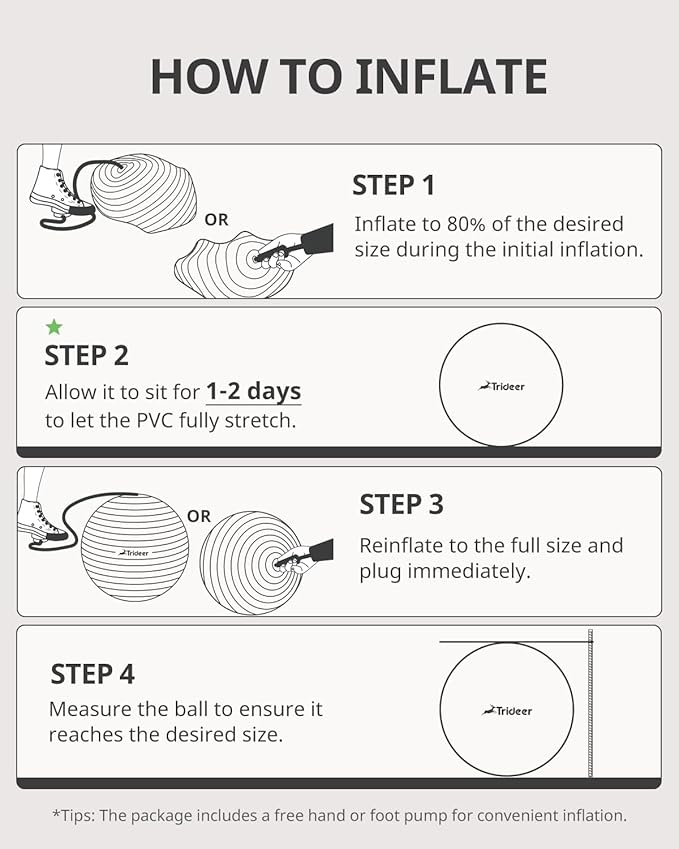 - [Easy Inflation and Perfect Packaging] -Trideer exercise ball comes with a quick inflation pump (45/55/65cm equipped with a hand pump; 75/85cm equipped with a foot pump), 2 air stoppers, and detailed instructions. Available in 5 sizes—45cm, 55cm, 65cm, 75cm, 85cm—to meet all your needs.