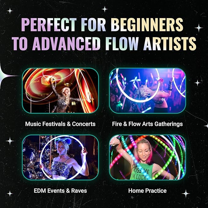 - 👪Fun for All Skill Levels: Create a stunning LED light show at home, music festivals, or parties! Whether you're a flow arts beginner or a seasoned pro, this hoop is ideal for honing your skills, exercising and physical coordination. It also makes an excellent gift for all ages!