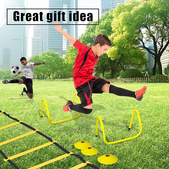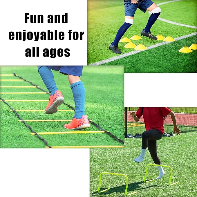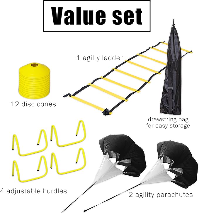 - SPEED AND AGILITY TRAINING EQUIPMENT IS GREAT VALUE - Set includes agility ladder, 2 resistance parachutes, 4 adjustable hurdles, 12 disc cones, and a drawstring bag