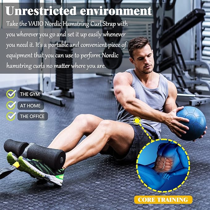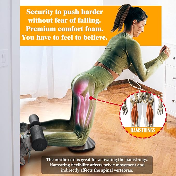 • Sturdy and reliable double needle stitching, the VAIIO Nordic Hamstring Curl Strap is perfect for Nordic curls, Sit-ups, Spanish squat, Ab workout, Core training, Razor curls, and more. The mountaineering-grade buckle is adjustable and robust to fix the strap tightly during exercise, while the kneeling mat offers comfort for knees, and the enlarged sponge anchor prevents the door from scratching.