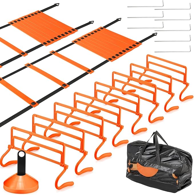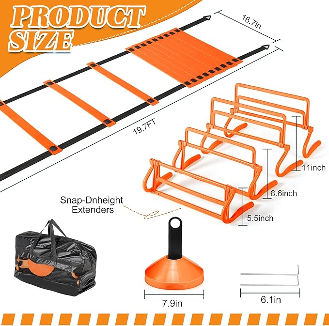 - Sufficient Quantity: you will receive 2 pcs 20 ft 12 rung agility ladder with 8 pcs ground stakes, 8 pcs agility hurdles with 24 disc cones and 1 pcs carry bag, whether you're a beginner or an expert, these equipment can meet your training needs