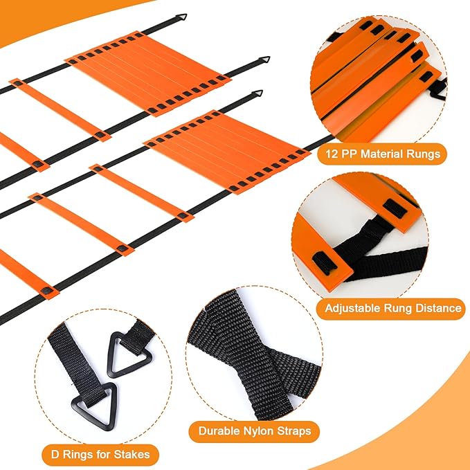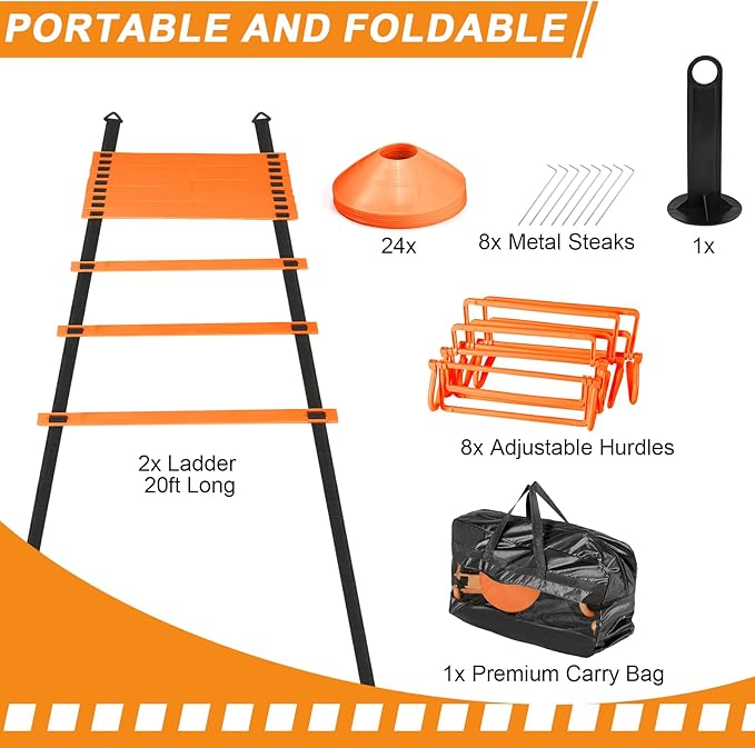 - Sufficient Quantity: you will receive 2 pcs 20 ft 12 rung agility ladder with 8 pcs ground stakes, 8 pcs agility hurdles with 24 disc cones and 1 pcs carry bag, whether you're a beginner or an expert, these equipment can meet your training needs