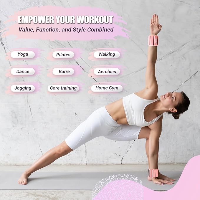 - [PERFECT FOR EVERYDAY FITNESS] Our wearable adjustable wrist and ankle weights set of 2 with a total weight of 2LBS are perfect for women, men and beginners. It adds weight to your arms, wrists and ankles, and you can wear the weight bracelet for Pilates, yoga, swimming, aerobics, running and walking and more. These Pilates weights create constant resistance to help you burn more calories and improve your indoor or outdoor training.