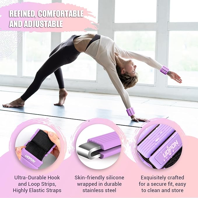 - [PERFECT FOR EVERYDAY FITNESS] Our wearable adjustable wrist and ankle weights set of 2 with a total weight of 2LBS are perfect for women, men and beginners. It adds weight to your arms, wrists and ankles, and you can wear the weight bracelet for Pilates, yoga, swimming, aerobics, running and walking and more. These Pilates weights create constant resistance to help you burn more calories and improve your indoor or outdoor training.