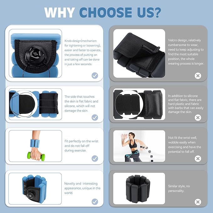 - NOVEL and PRACTICAL DESIGN -- Combined with the innovative knob design, overcome the defects of similar products(designed with Velcro) and make one-handed operation more convenient. Unique knob operation structure (rotate right to keep tightening until it fits your wrist; just rotate it once to the left to pull it open and take it off) to help you put on the sports weight bracelet quickly and accurately, and fit your wrist better without falling off when wearing.