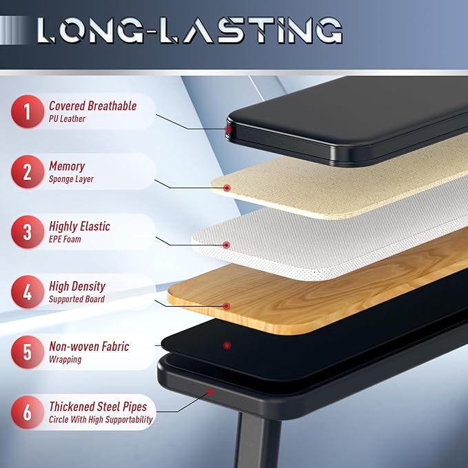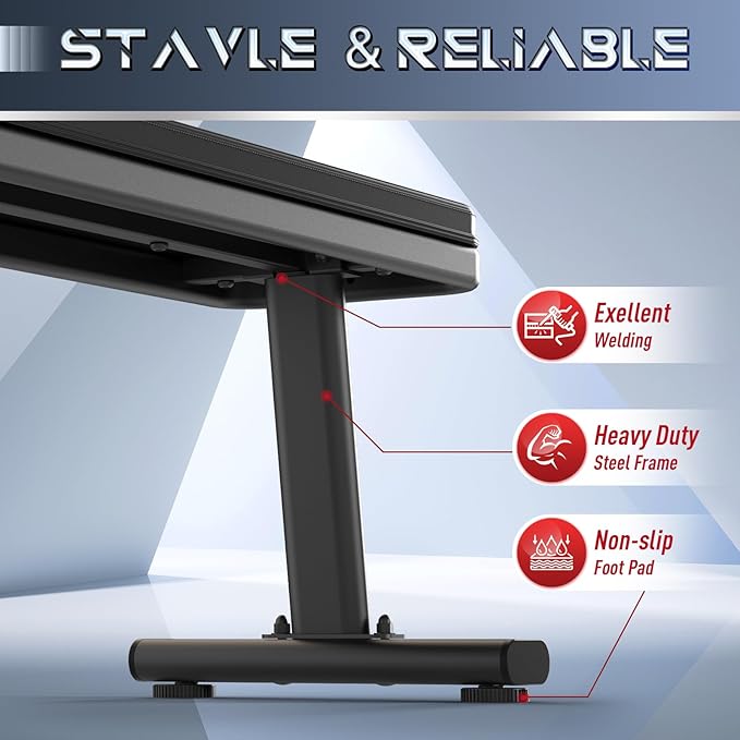 - 【Max Load 1455LBS/660KG】With a maximum load-bearing capacity of 1455LB/660KG, our fitness bench is engineered to withstand intense workouts and heavyweights. Crafted with thick steel material, the workout bench is built to last. The flat bench ensures stability even during the most challenging exercises.