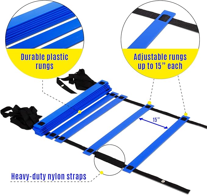 • BOOST FOOTWORK FOR VARIOUS TRAINING LEVEL: Exercise ladder is designed with 8, 12, and 20 rungs; Rung-to-rung distance can be adjusted up to 15 inches, making soccer equipment suitable for different skill sets levels; Instruction is included