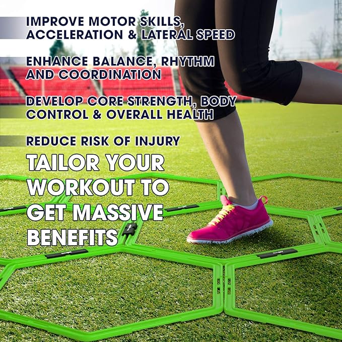 - SET OF 12 HEXAGON RINGS: This package includes 12 connected agility hexagon rings, each separate ring has a 19” diameter. Perfect agility training equipment for footwork training and agility training.