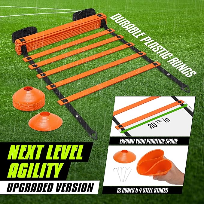 • HEAVY DUTY AGILITY LADDER: This agility ladder is designed for heavy-duty use, featuring a durable nylon construction and sturdy plastic rungs. It's perfect for a variety of training exercises, including speed and agility drills, soccer training, and footwork workouts.